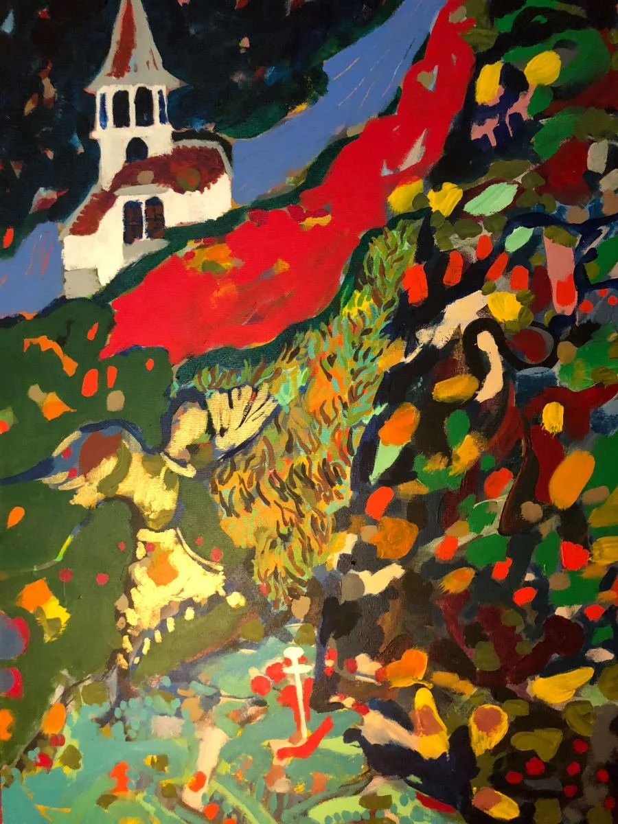 The content of this painting came to me through the creative process I call intuitive expressivism (see next page). The painting began as pure improvising of paint and brush on canvas – Spiritual Doodling if you will. In this active contemplation process, images begin to appear in partial as emerging forms. My perceptual/cognitive perception driven by nonconscious intuition begins to perceive patterns that connect. Once the content begins to reveal itself, I strive to facilitate this randomness into a composition of meaning. In this piece I attempted to replicate a theological tension and gap between ideas using color, form, composition, and representation.